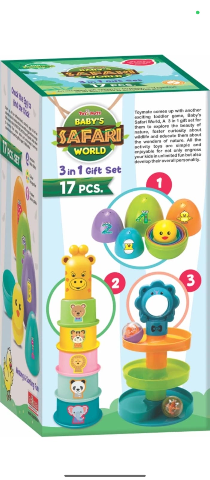 - 3-in-1 Safari-Themed Playset – Includes nesting eggs, stacking cups with animal designs, and a spiral ball drop ramp, giving toddlers multiple ways to learn and play.