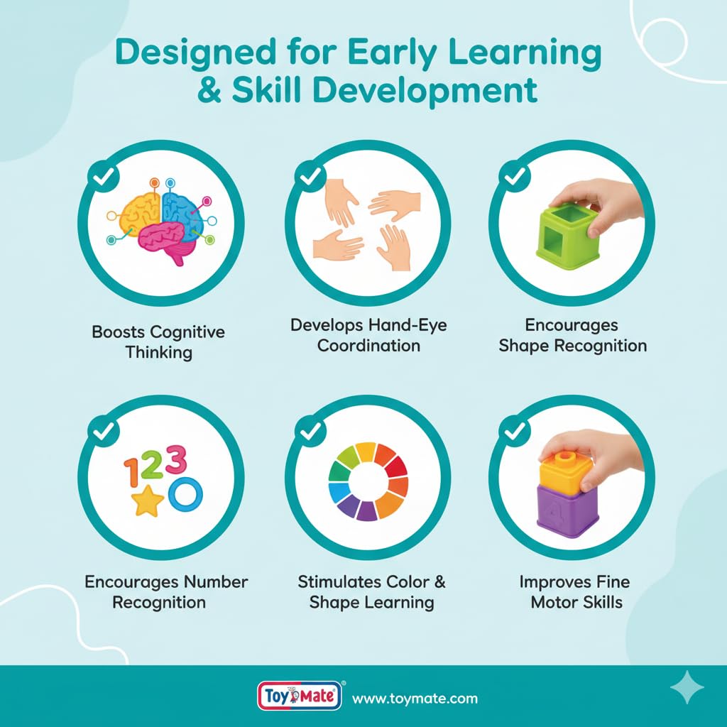 - COMPLETE SET: Includes multiple brightly coloured cups and blocks that can be stacked, sorted, and nested, perfect for both independent and guided play